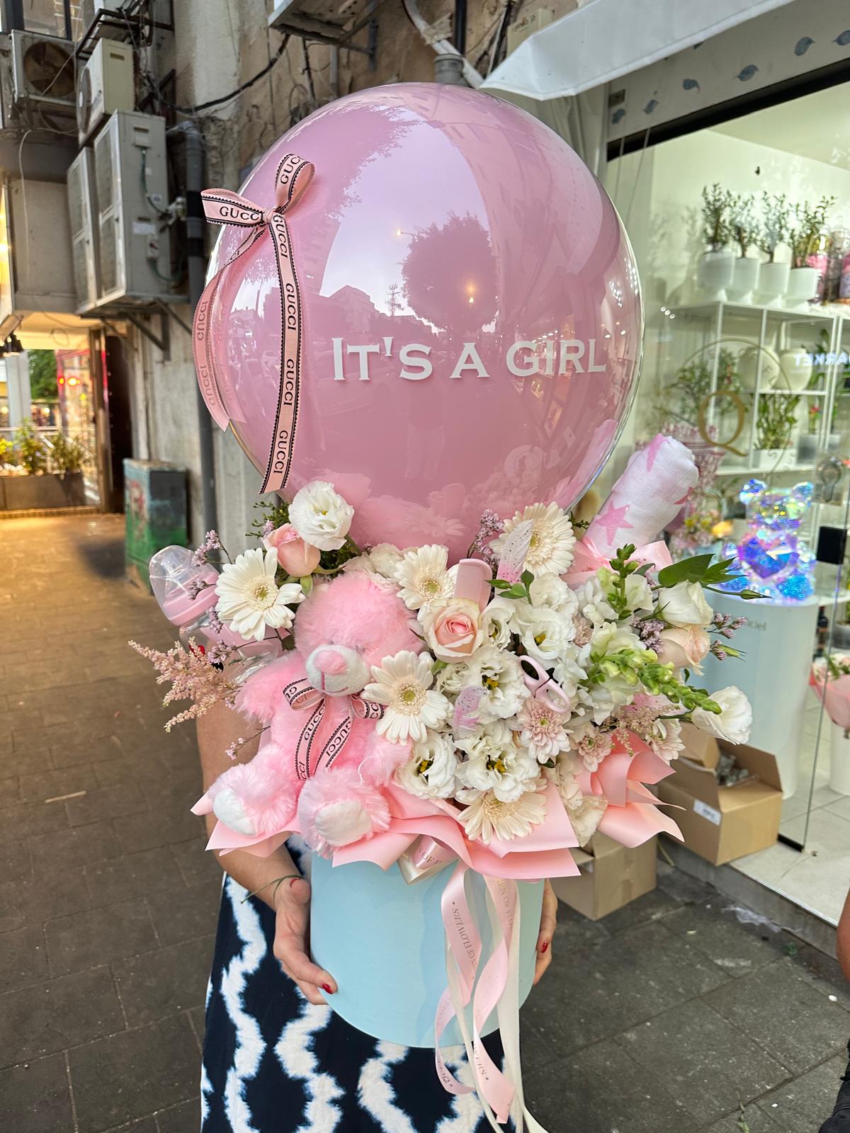 A beautiful newborn gift arrangement featuring fresh flowers, a balloon, and essential baby products. Designed in soft, neutral colors to suit both baby boys and girls, perfect for welcoming a new little one.
