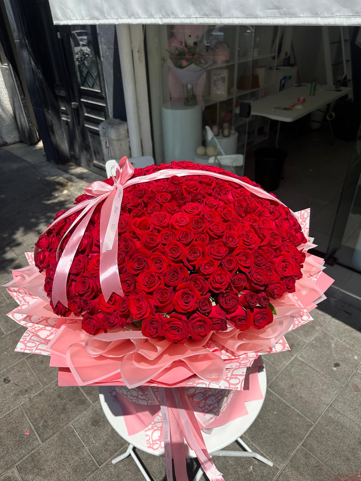 A breathtaking luxury bouquet of 300 red roses, elegantly arranged and wrapped to create an unforgettable statement of love and passion